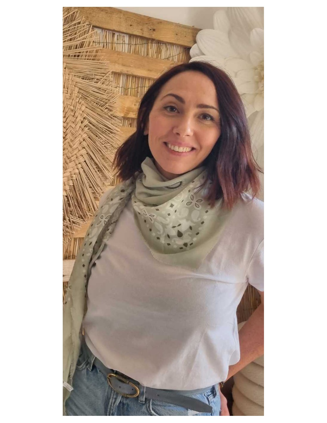 Foulard imprimé bandana sauge au design intemporel. Léger et polyvalent, il sera parfait porté autour du cou, dans les cheveux ou sur un sac pour un style chic et décontracté.