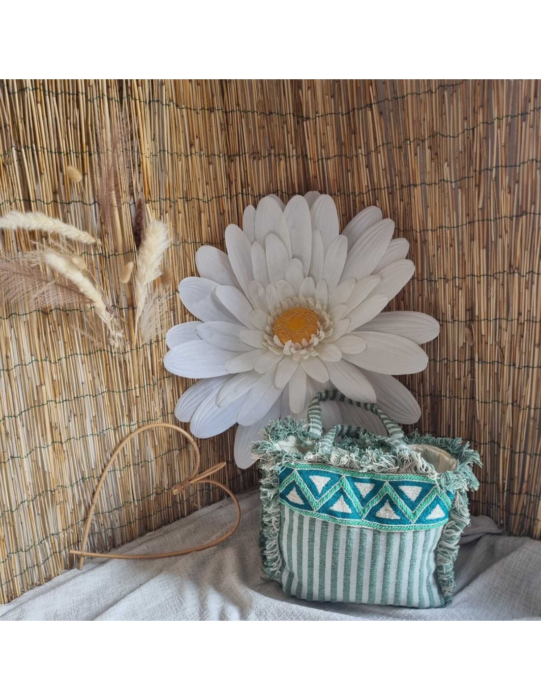 Emportez tout ce dont vous avez besoin avec style ! Sac fourre tout, fermeture à pression, en coton rayé, orné de perles délicates. Spacieux, tendance et facile à porter. Parfait pour la plage, le marché ou vos sorties du quotidien.
