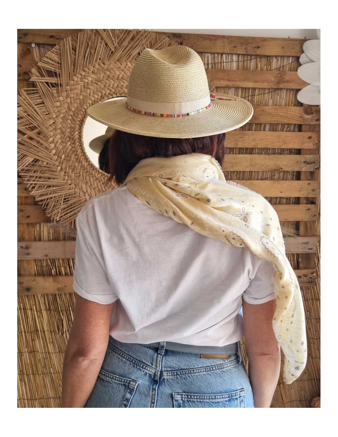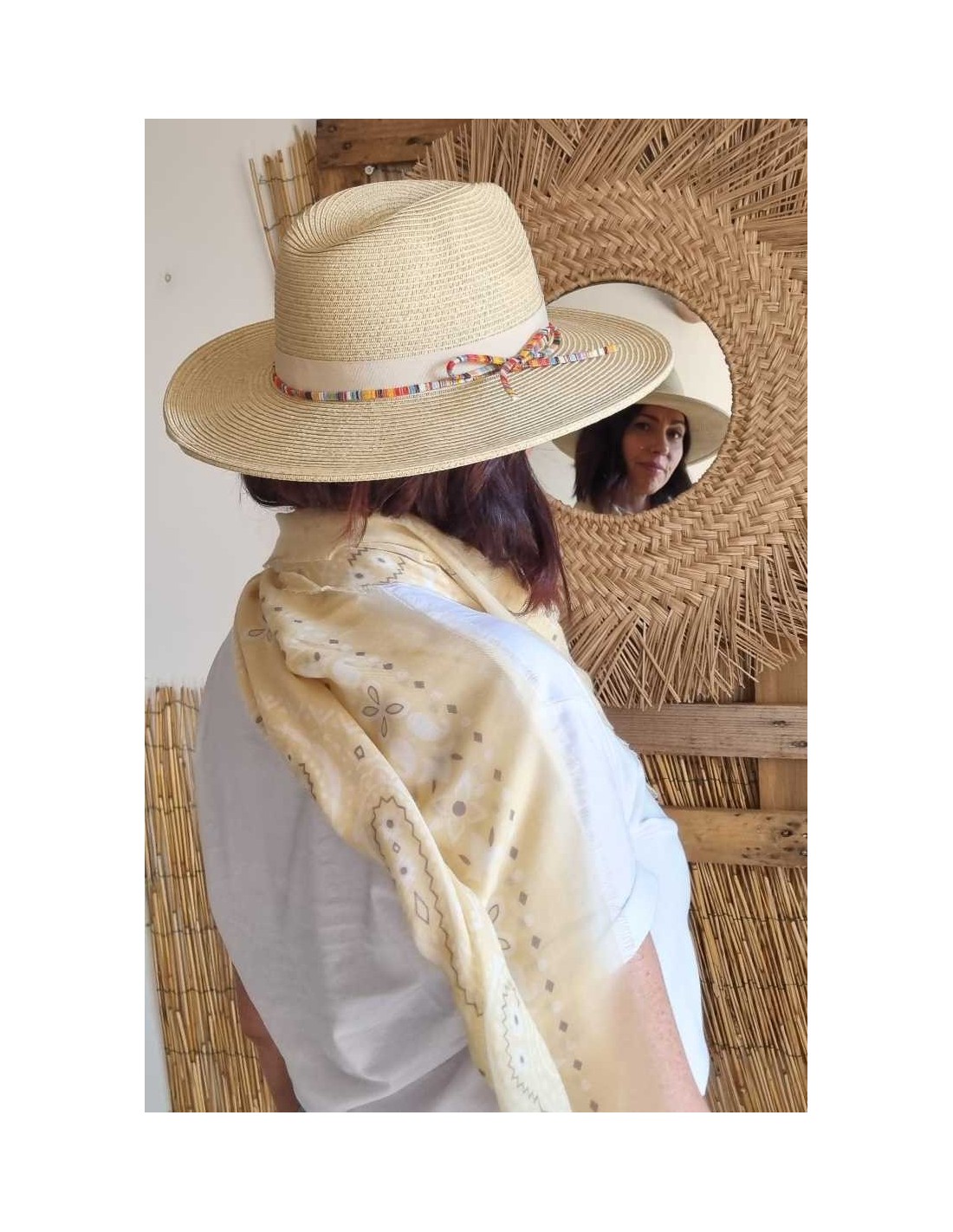 Un chapeau en paille finement texturé réhaussé d'un bandeau lisse accentué d'une bordure multicolore tissée, qui se noue en un nœud décoratif ajoutant une touche ludique et détaillée.