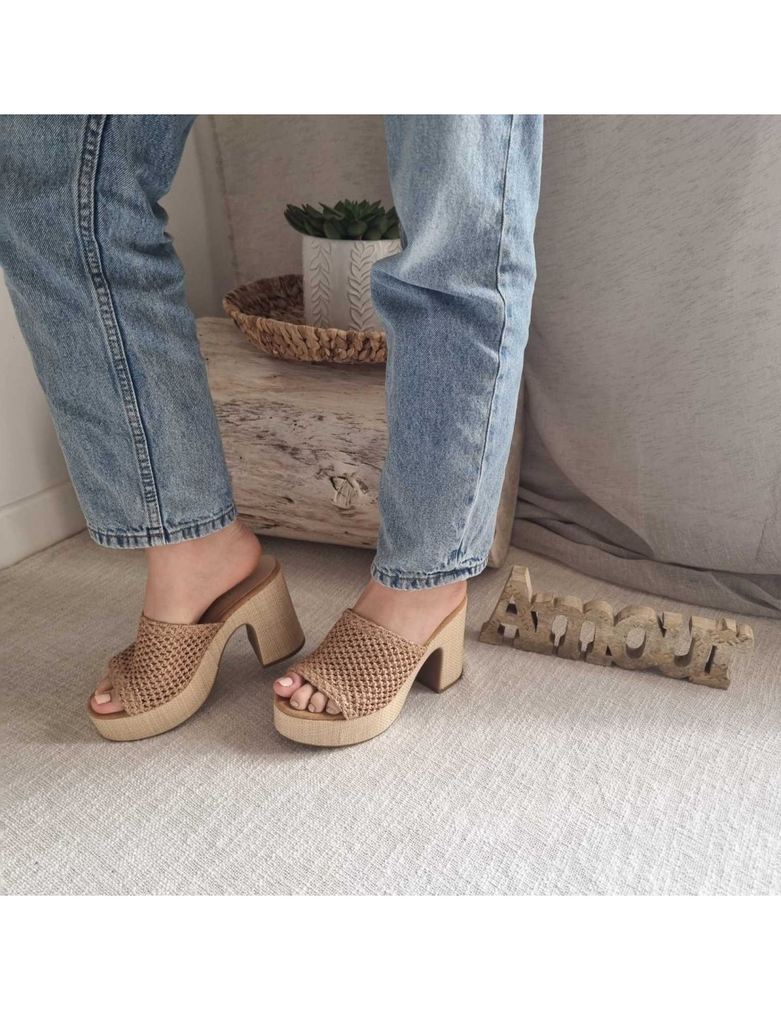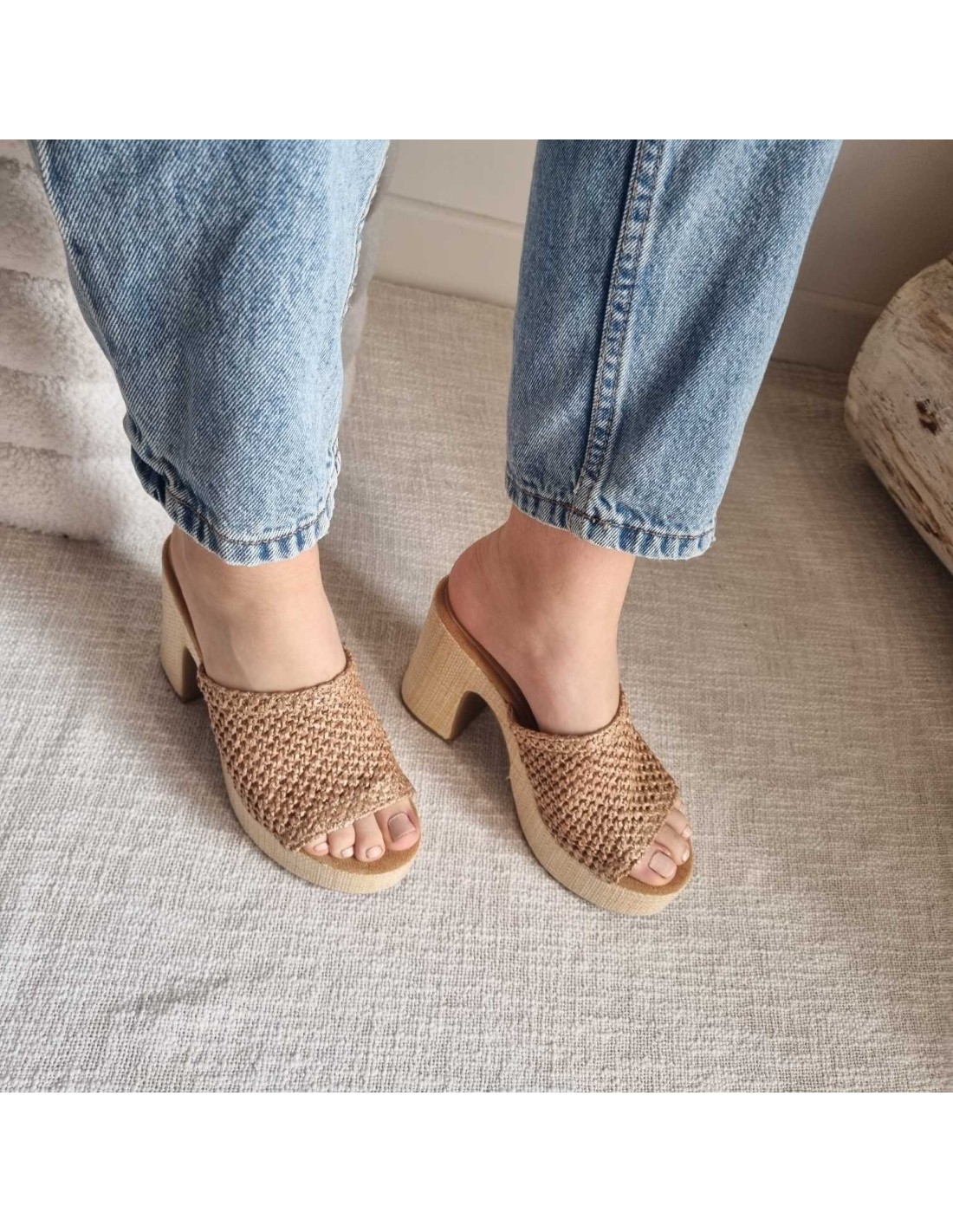 Sabots compensés à large bride tressée camel INDIRA