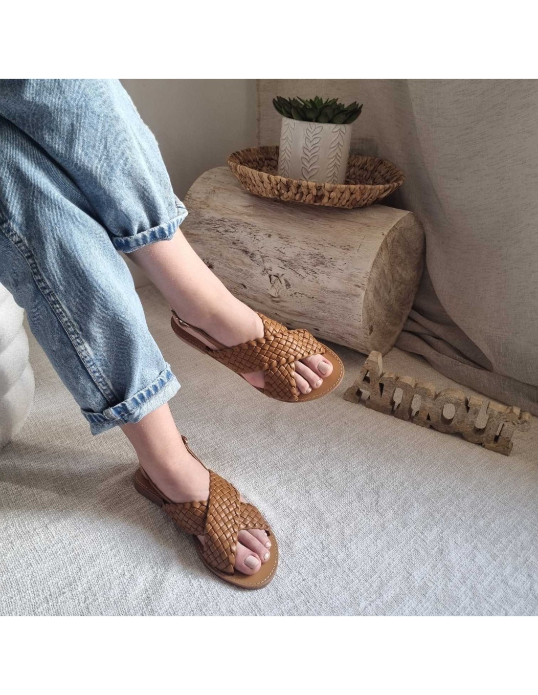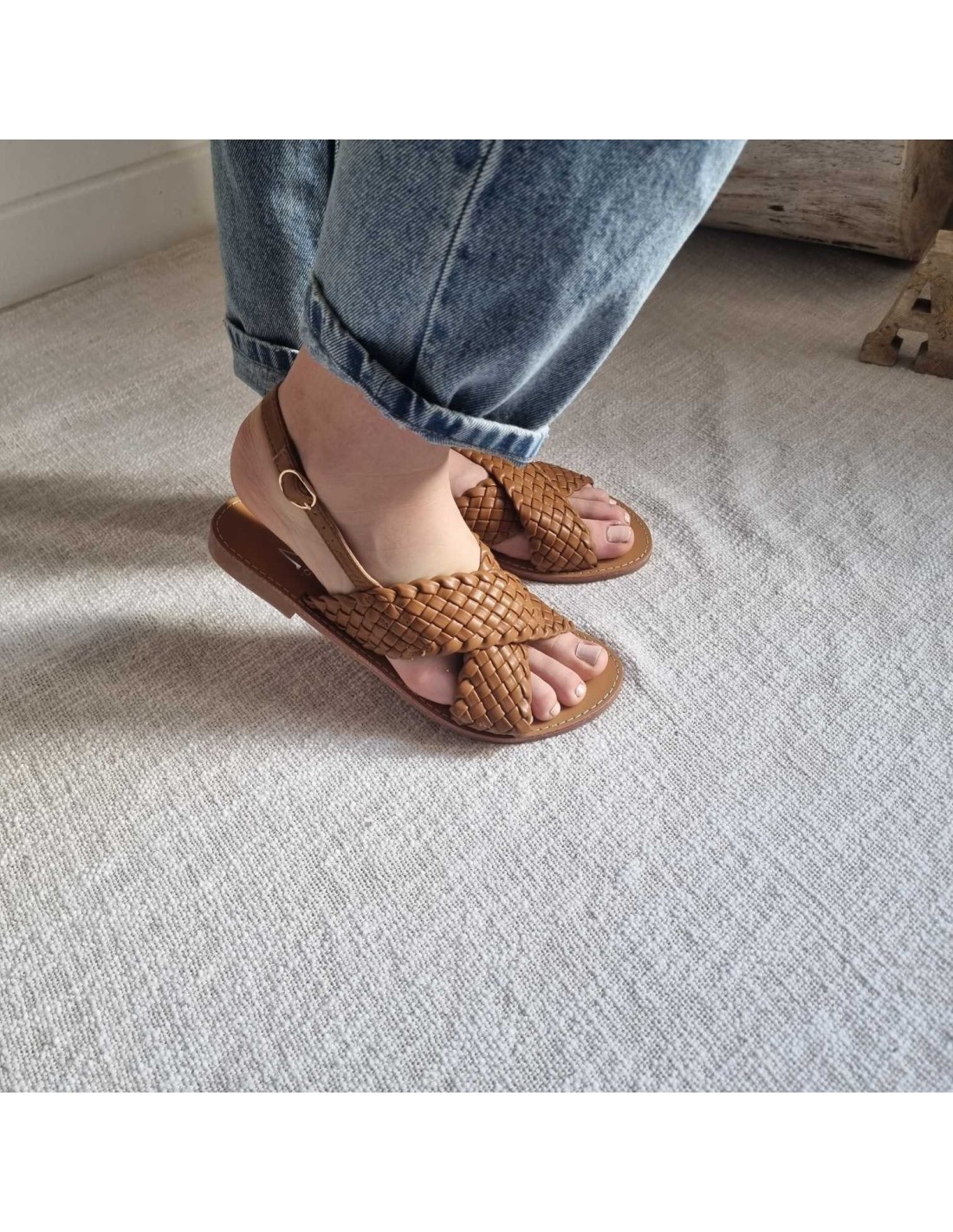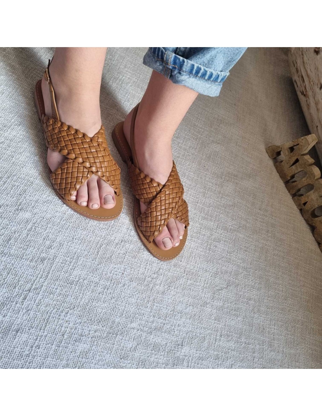 Sandales plates à brides croisées tressées camel TAHIA