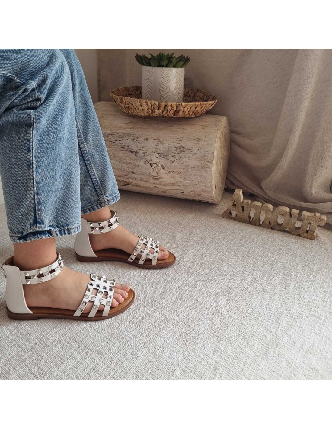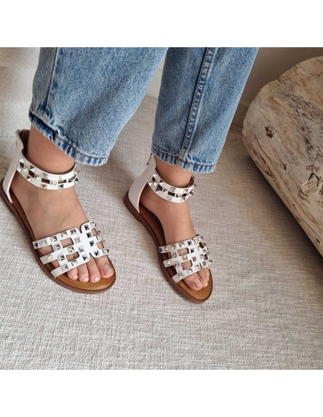 Sandales plates avec lanières blanches ornées de clous argentés de forme carrés, la fermeture zippée à l'arrière de la chaussure permet un enfilage facile. Optez pour une allure rock et élégante.