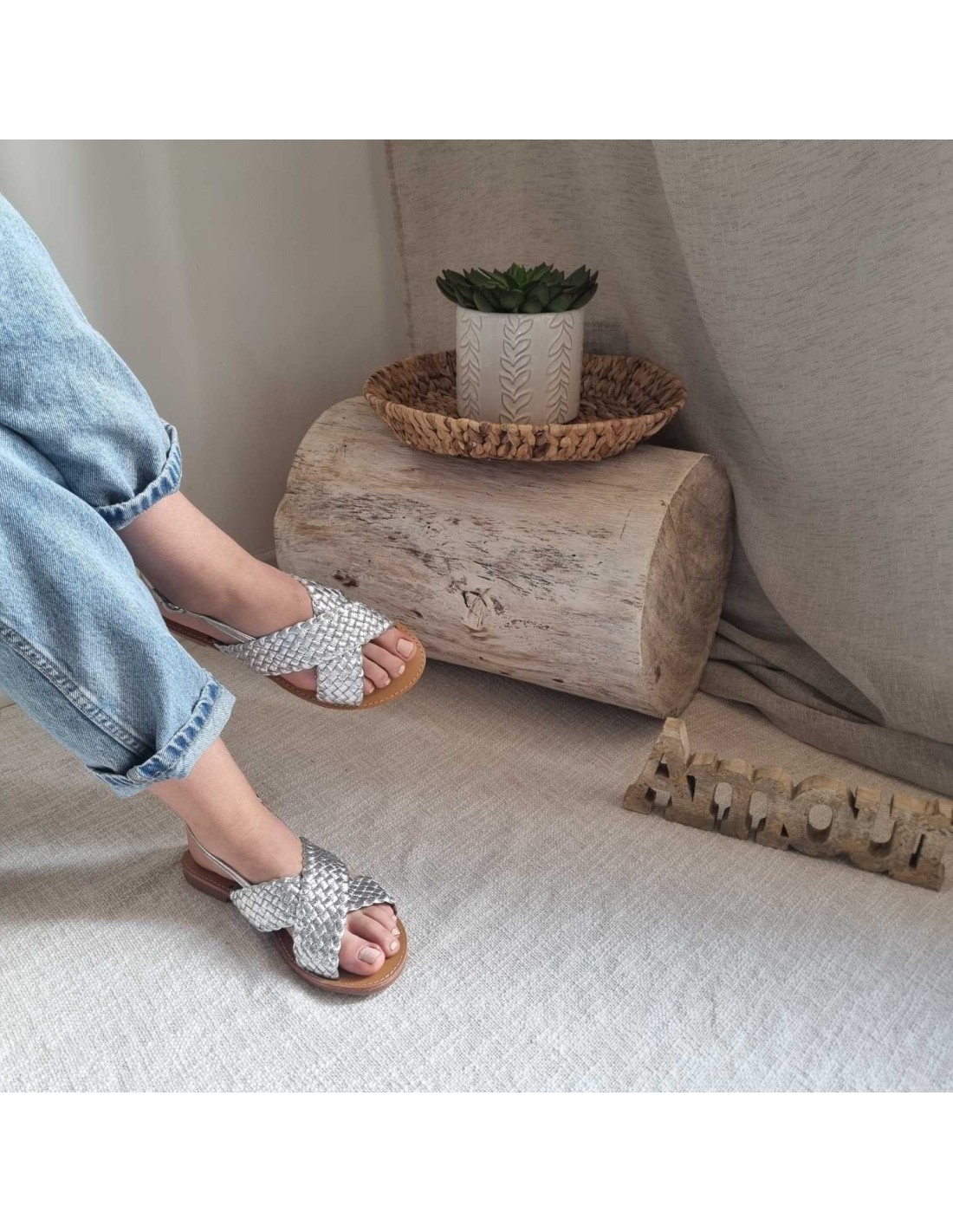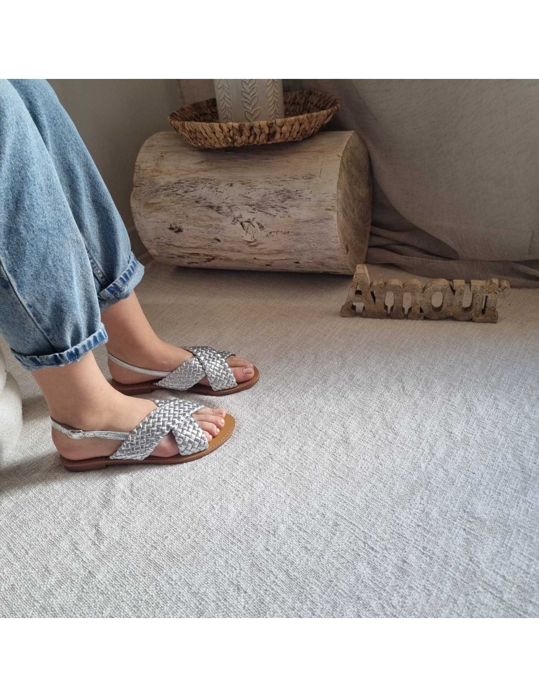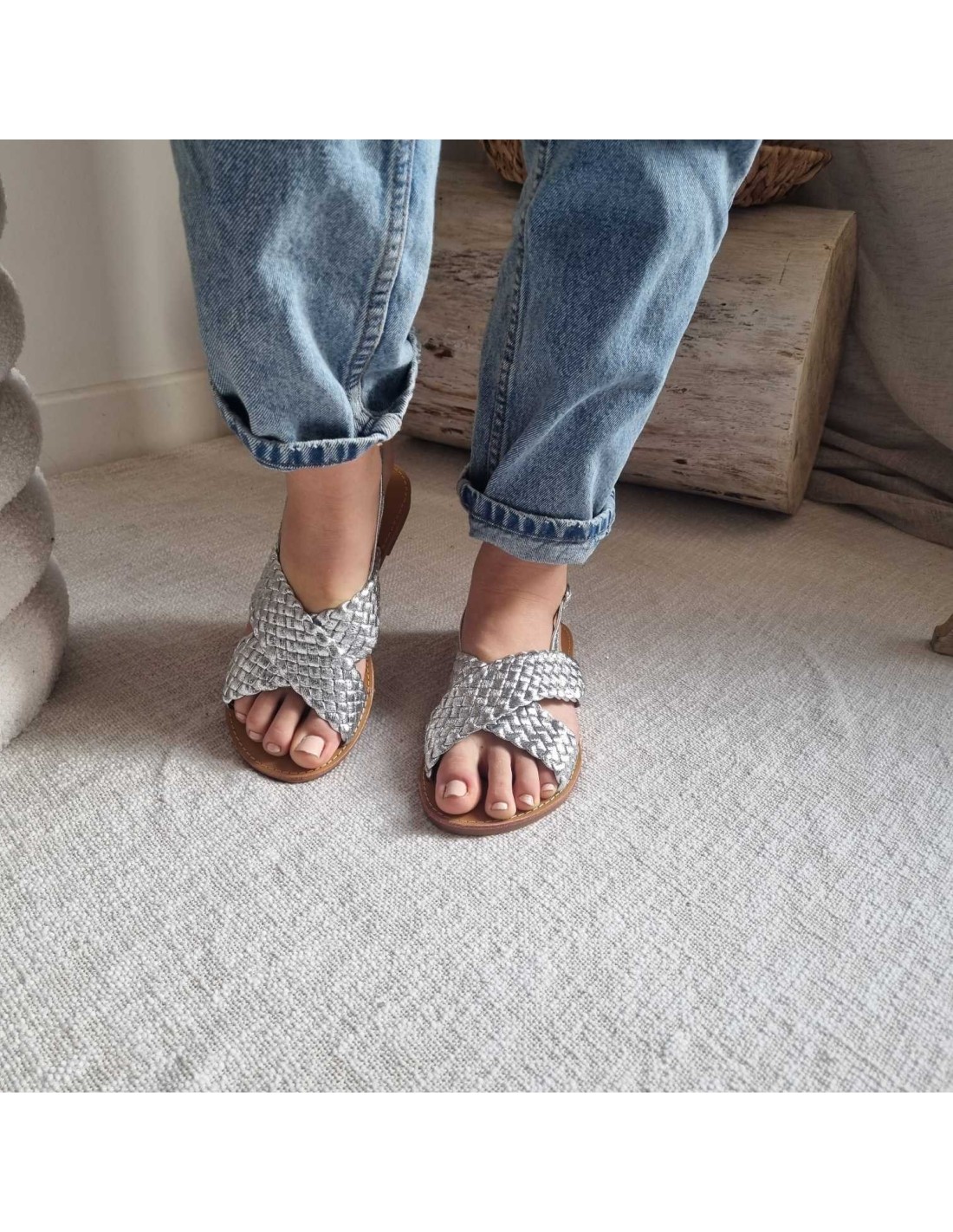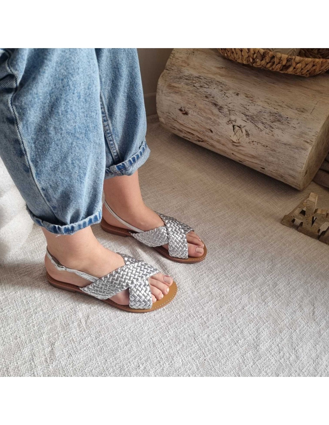 Sandales plates à brides croisées tressées argenté TAHIA