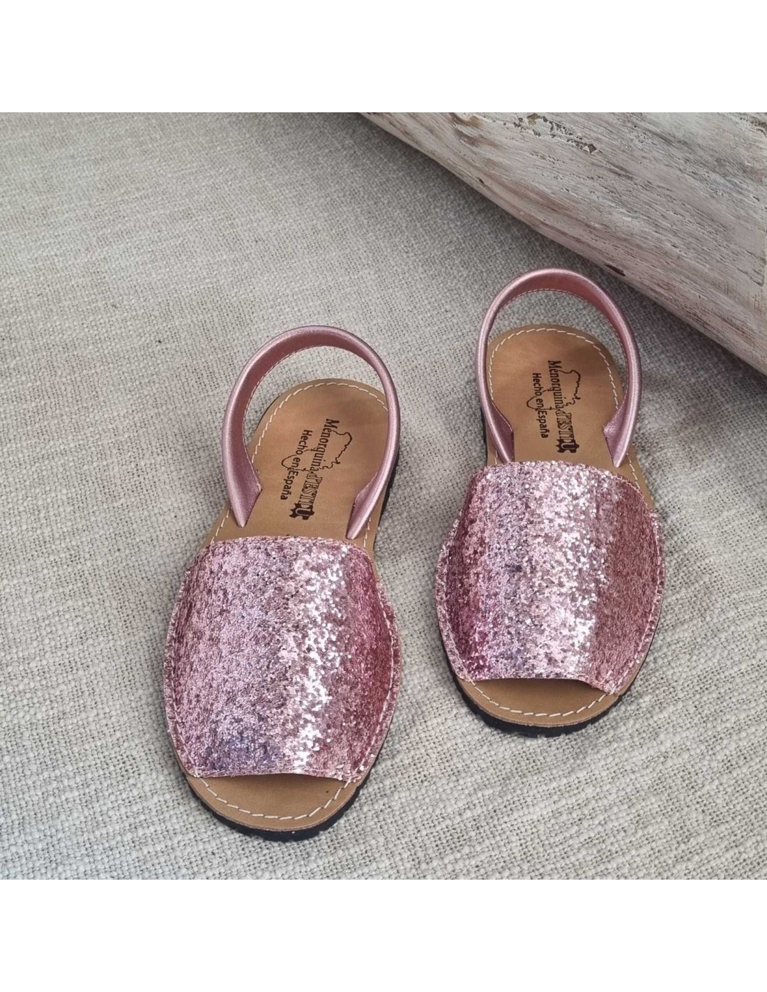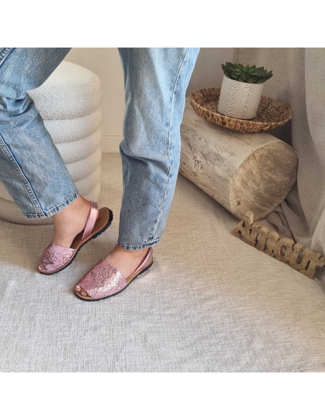 Ajouter une touche d'éclat à votre tenue avec la sandales menorquine en cuir pailletés roses.