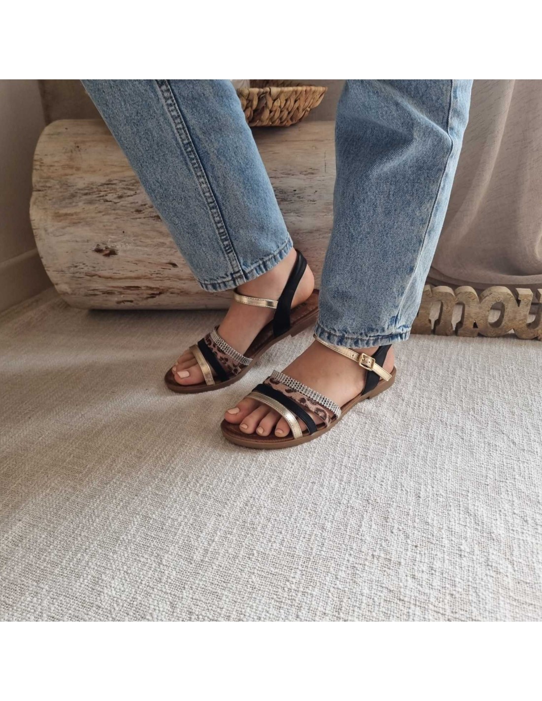 Sandales plates multi brides noires/dorées touche léo KANOA