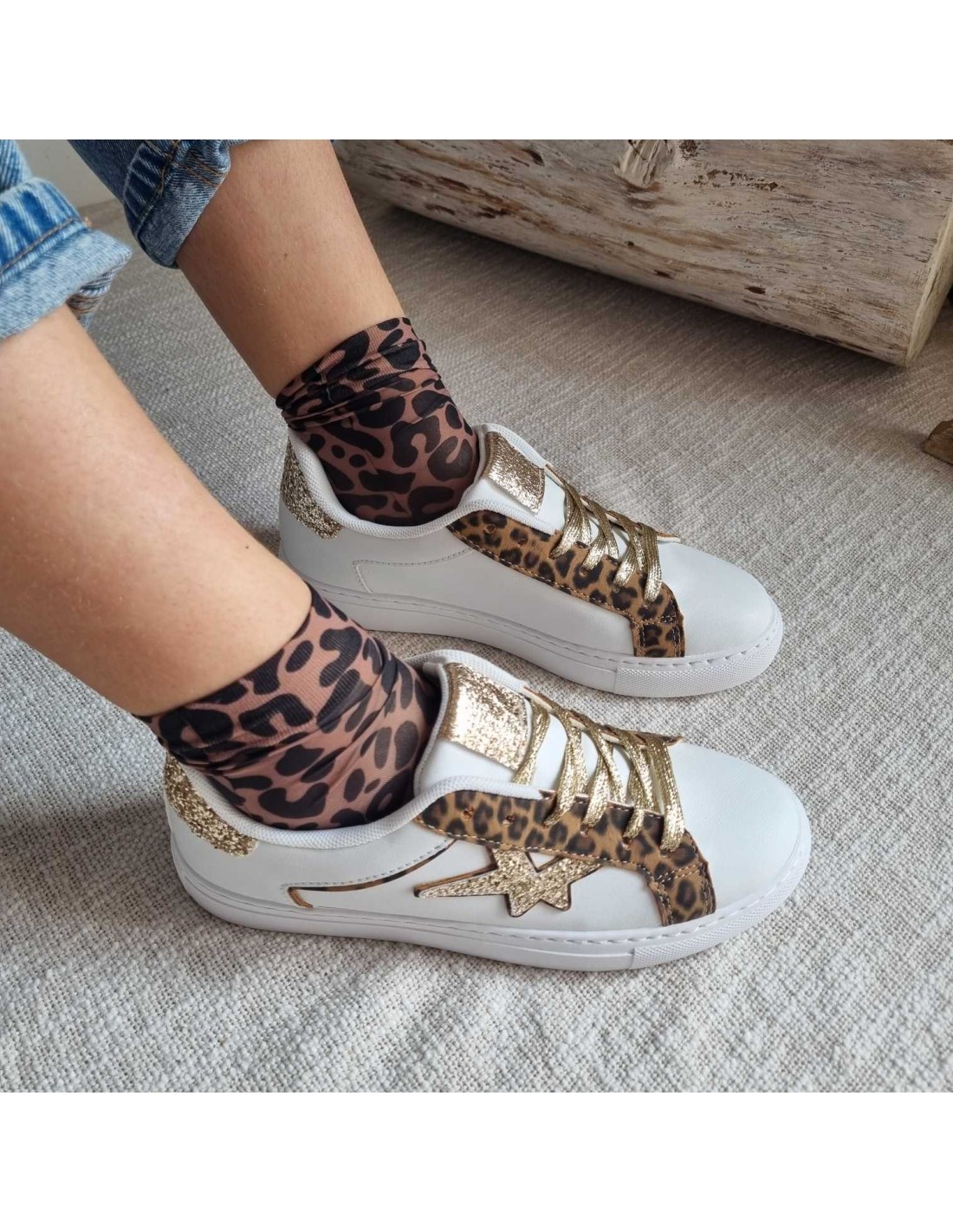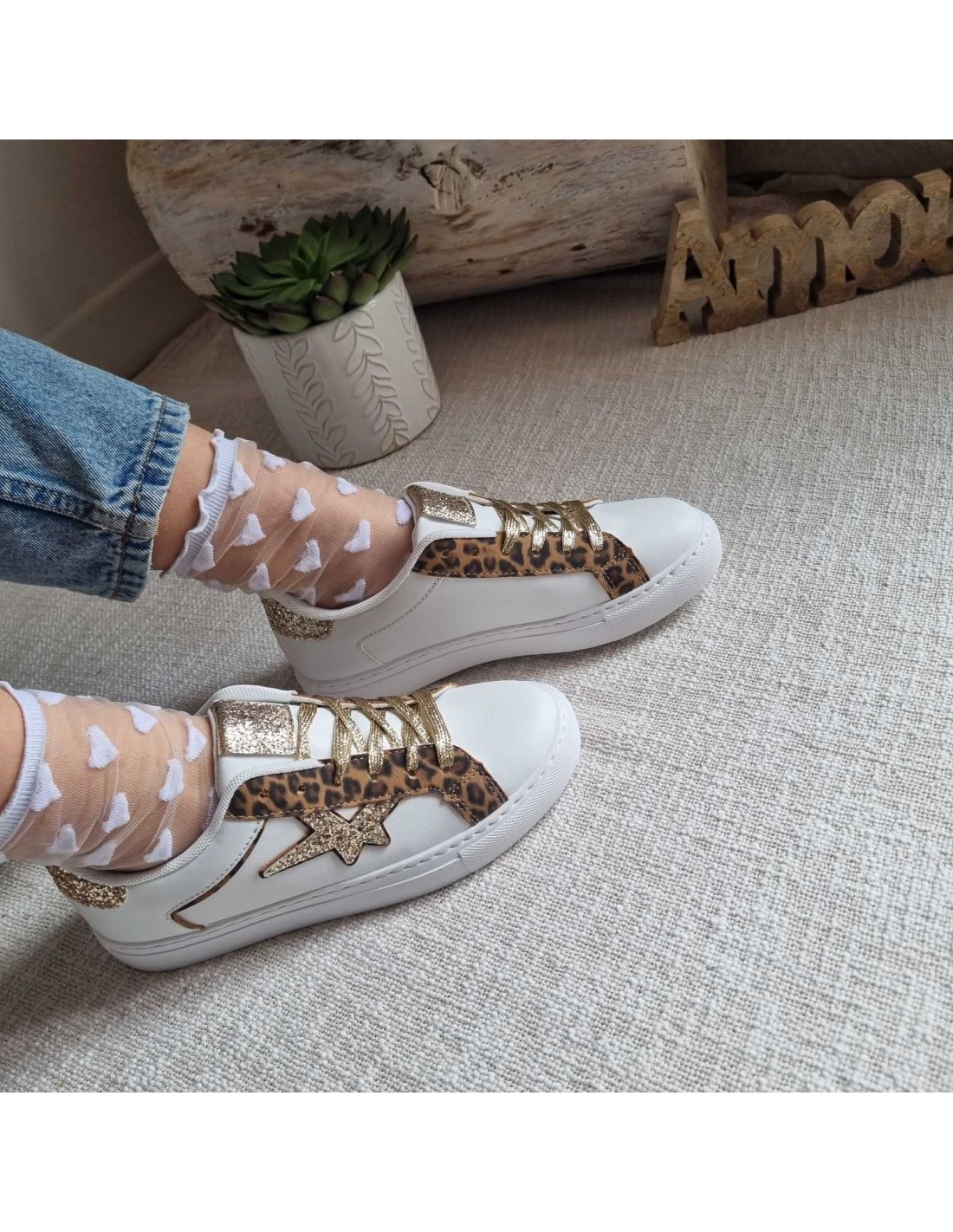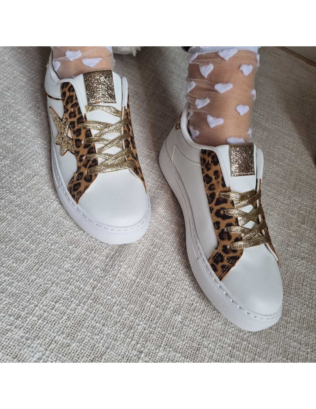 Superbes sneakers bas en coloris blanc et contrefort léopard avec étoile à paillette dorée apporte un style unique à votre look.