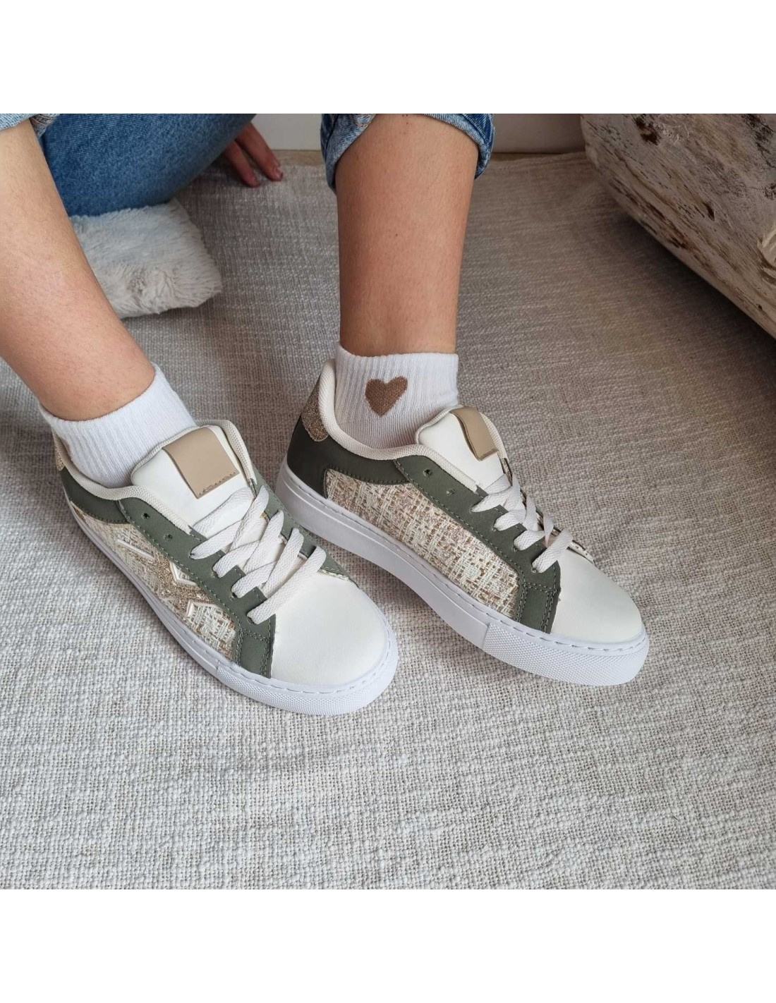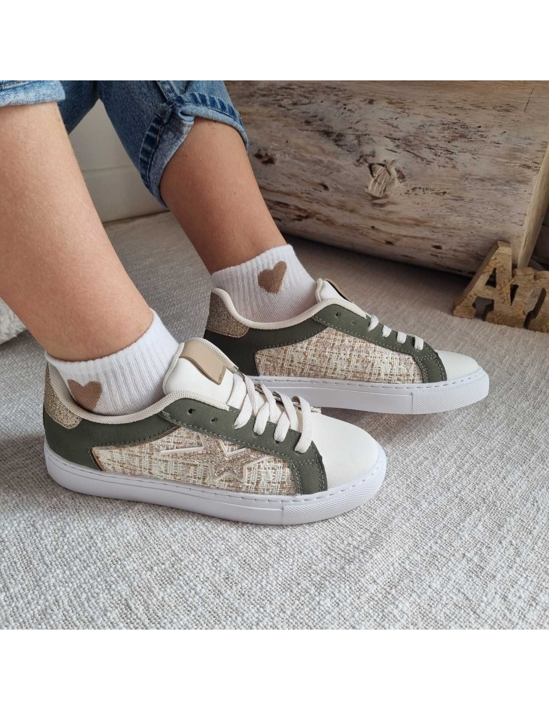 Magnifiques sneakers bas en tweed avec découpe en forme d'étoile dorée ainsi que son contrefort de coloris kaki. Elles apportent un style décontracté parfait pour un style tendance ainsi que pour vos tenues casual.