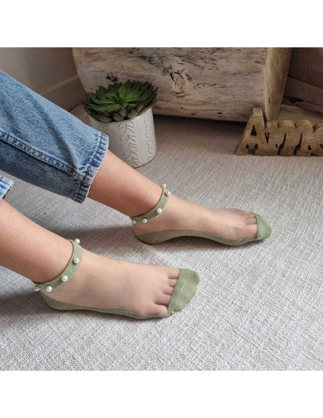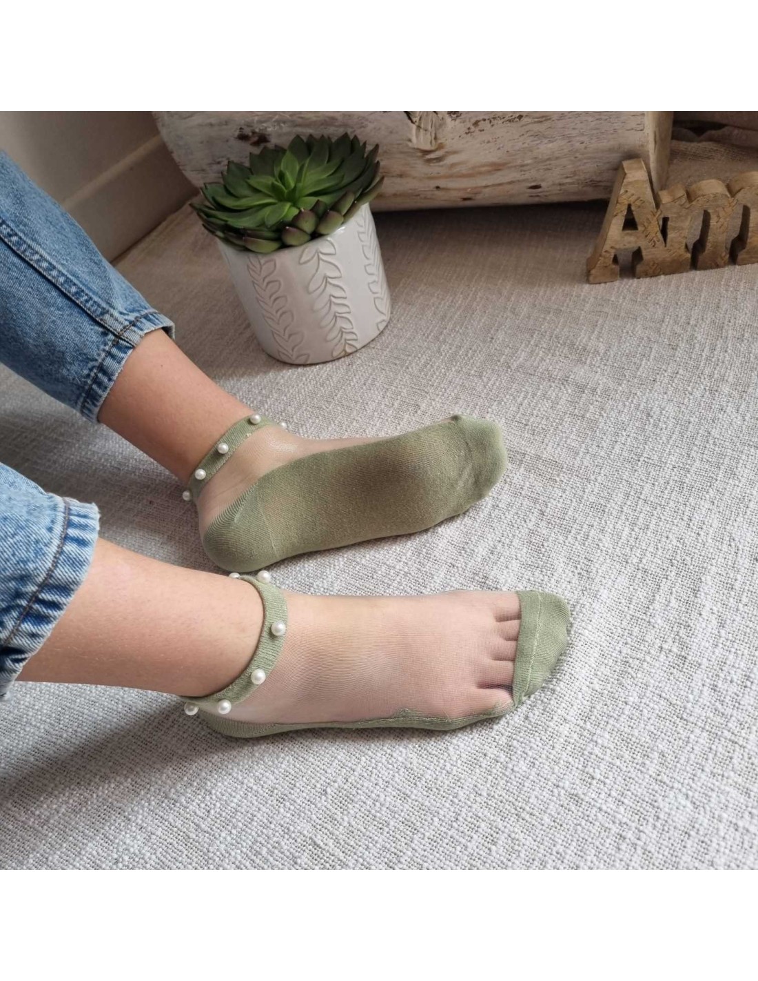 Jolies mi-chaussettes fines kaki originales avec renfort semelle et talon, ornées de perles blanches offre un effet chic à la cheville.