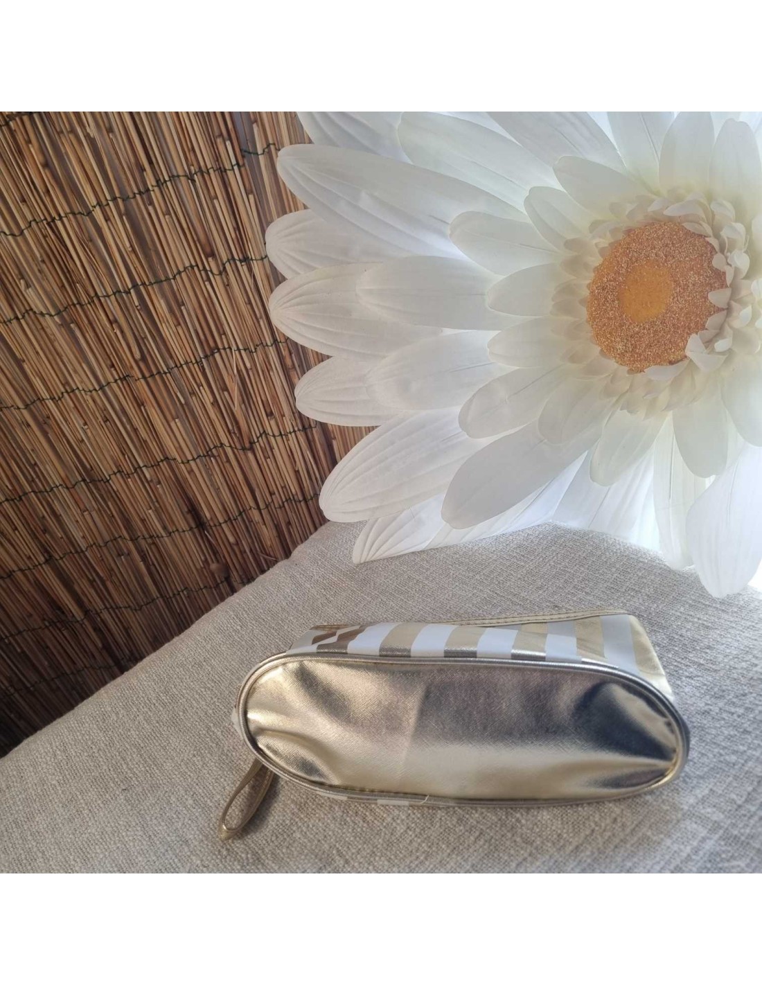 Cette grande pochette à rayures blanche/doré est idéale pour organiser et protéger vos essentiels. Conçue en matière imperméable, elle garde vos effets personnels à l'abris de l'humidité. Sa fermeture zippée assure une ouverture et une fermeture faciles. Sa lanière permet de la transporter facilement à la main ou de l'attacher à un sac.